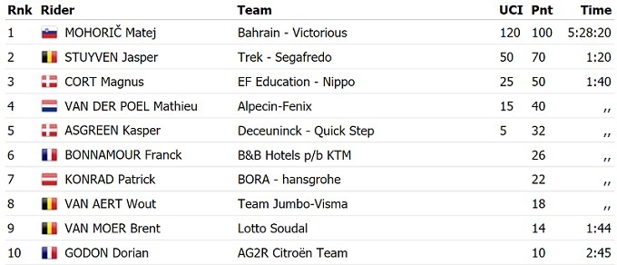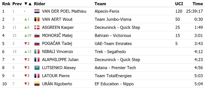 В общем зачете лидерство упрочил Матье Ван дер Пул, который также принимал участие в отрыве дня.