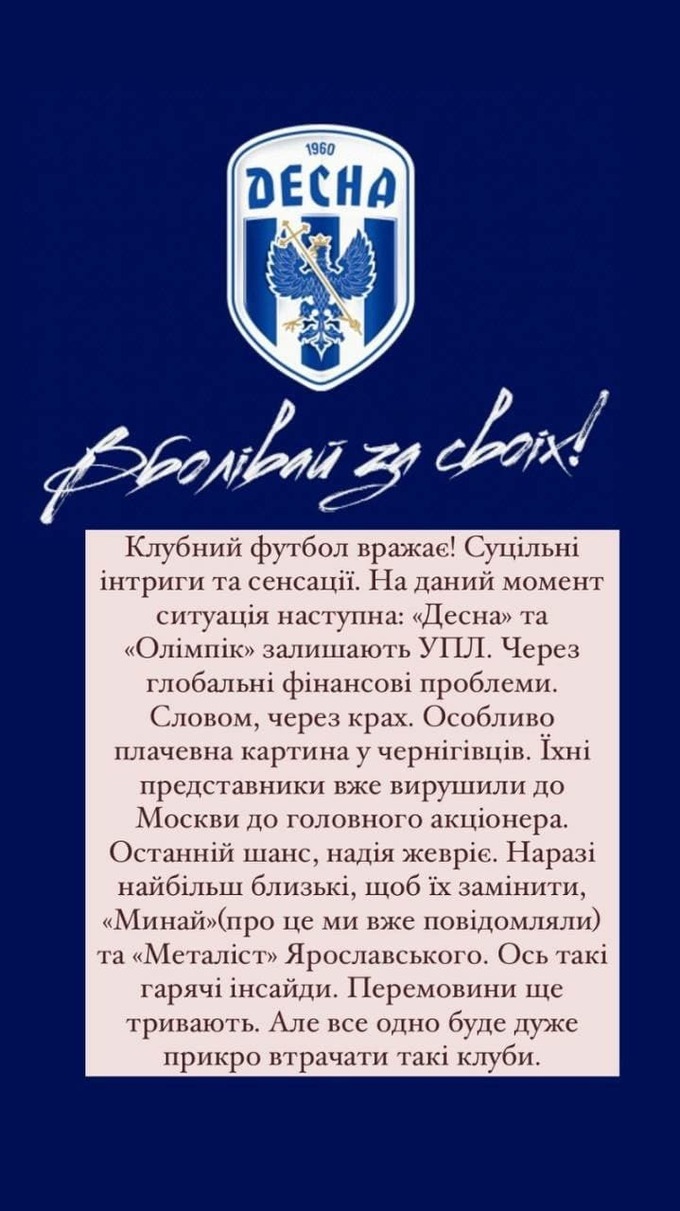 Журналист программы «Футбольный формат» Олег Ящук сообщил, что черниговская «Десна» и донецкий «Олимпик» покинут УПЛ.