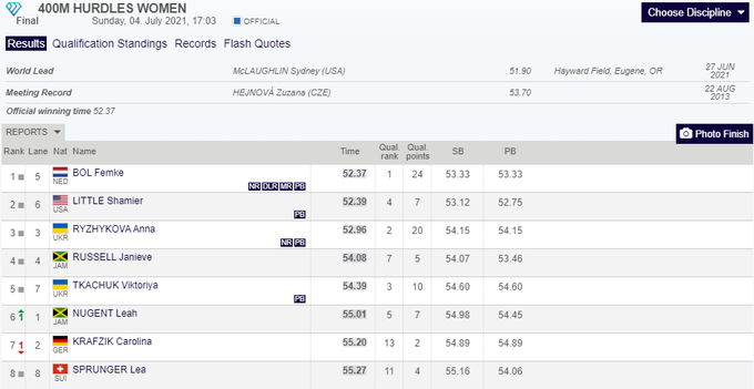 Кроме того, украинка Анна Рыжикова выиграла бронзовую медаль в беге на 400 метров с барьерами, установив рекорд Украины (52,96)! Виктория Ткачук стала 5-й (54,39).