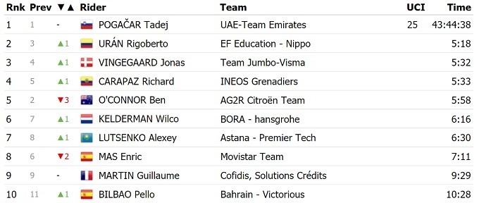 Лидером общего зачета остался словенец Тадей Погачар из команды «UAE Emirates».