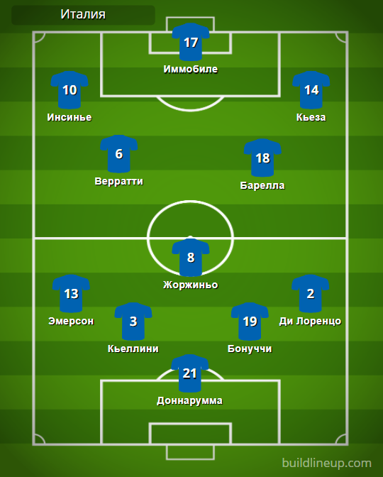 Италия: Доннарумма – Эмерсон (Флоренци, 117), Кьеллини, Бонуччи, Ди Лоренцо – Верратти (Локателли, 96), Жоржиньо, Барелла (Кристанте, 55) – Инсинье (Белотти, 91), Иммобиле (Берарди, 55), Кьеза (Бернардески, 85).