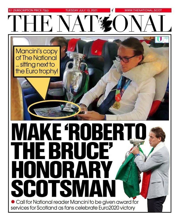 Накануне финала Евро-2020 шотландская газета «The National» вышла с фото наставника сборной Италии Роберто Манчини на первой полосе. Он был изображен в виде Вильяма Уолласа из фильма «Храброе сердце».