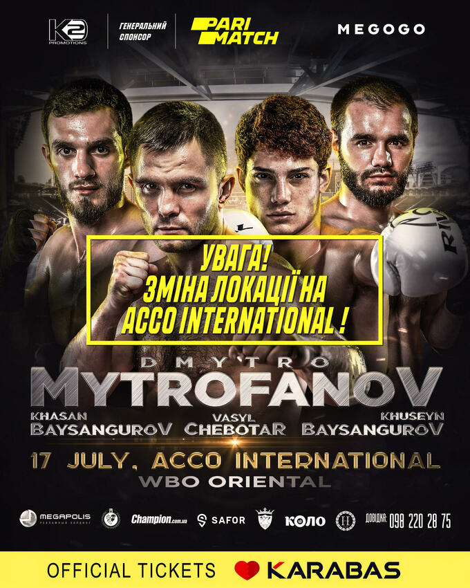 Бой Дмитрий Митрофанов – Рилливан Бабатунде состоится в субботу, 17 июля, в новой локации. Из-за аномальной жары в Киеве организаторы перенесли бой из Equides Club в выставочный центр «ACCO International».