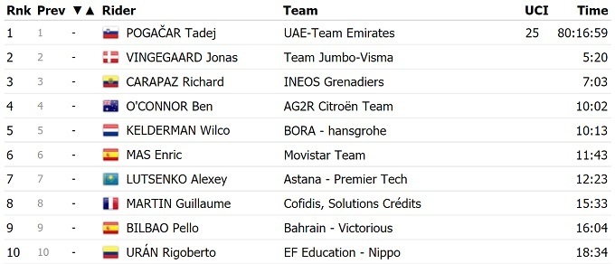 Восьмое место с отставанием в 57 секунд занял лидер общего зачета, словенец Тадей Погачар из «UAE Emirates». Он фактически обеспечил себе вторую подряд победу в общем зачете Тур де Франс: завтра гонщиков ждет традиционный «этап дружбы» в Париже.