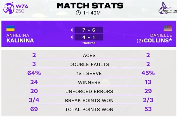 Ангелина Калинина (Украина) – Даниэль Коллинс (США) – 7:6(5), 4:1 (отказ)