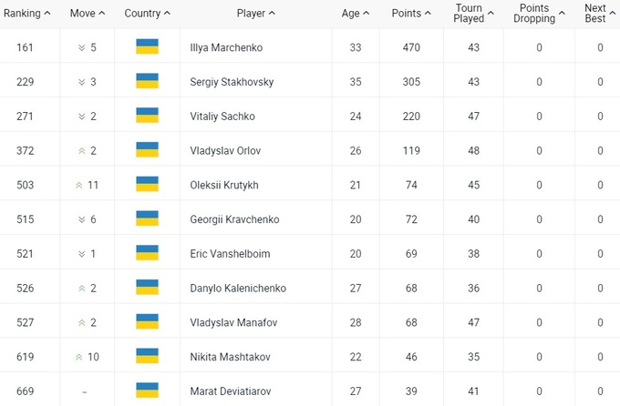Что касается украинцев, то Илья Марченко опустился на 5 позиций, Сергей Стаховский – на три, Виталий Сачко – на две. Владислав Орлов добавил три строчки, Алексей Крутых – одиннадцать.