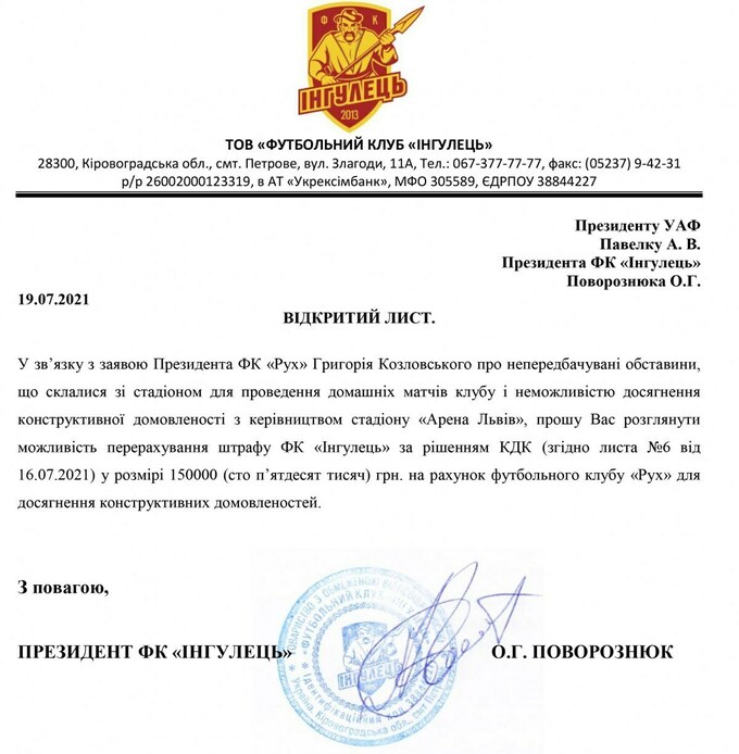 «В связи с заявлением президента «Руха» Григория Козловского о непредвиденных обстоятельствах, которые сложились со стадионом для проведения домашних матчей клуба и невозможностью достижения конструктивной договоренности с руководством стадиона «Арена Львов», прошу вас рассмотреть возможность перечисления штрафа «Ингульца» по решению КДК в размере 150 000 гривен на счет «Руха» для достижения конструктивных договоренностей», — говорится в письме Поворознюка.