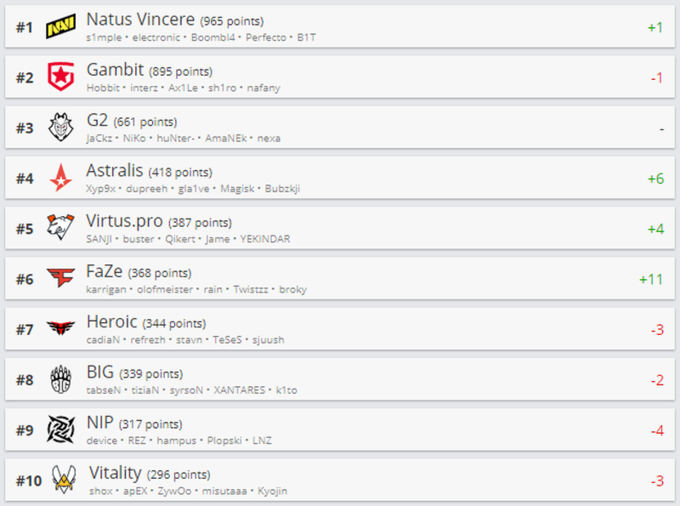 G2 Esports сохранила третье место, следом расположились Astralis, Virtus.pro и FaZe Clan, которые прибавили шесть, четыре и 11 пунктов соответственно. Team Vitality замкнула топ-10.