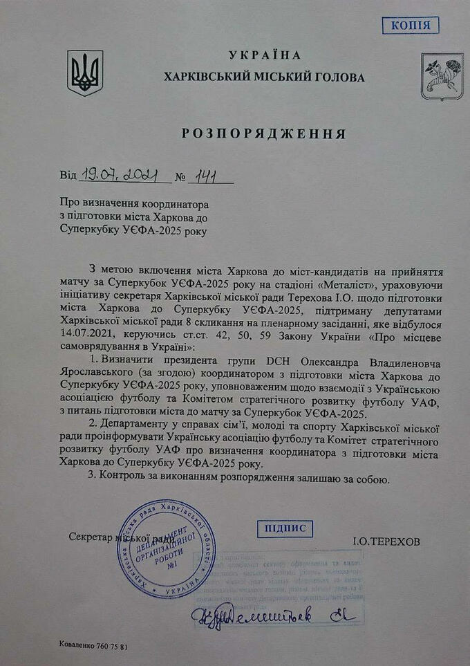 «Определить президента группы DCH Александра Владиленовича Ярославского (по согласию) координатором по подготовке города Харькова к Суперкубку УЕФА-2025 года, уполномоченным по взаимодействию с Украинской ассоциацией футбола и Комитетом стратегического развития футбола УАФ, по вопросам подготовки города к матчу за Суперкубок УЕФА-2025», — сказано в документе.