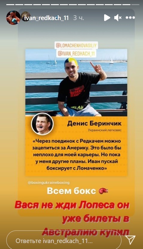 Также Редкач добавил на рассуждение Беринчика о Ломаченко, усомнившись в реванше Василия с Теофимо Лопесом: