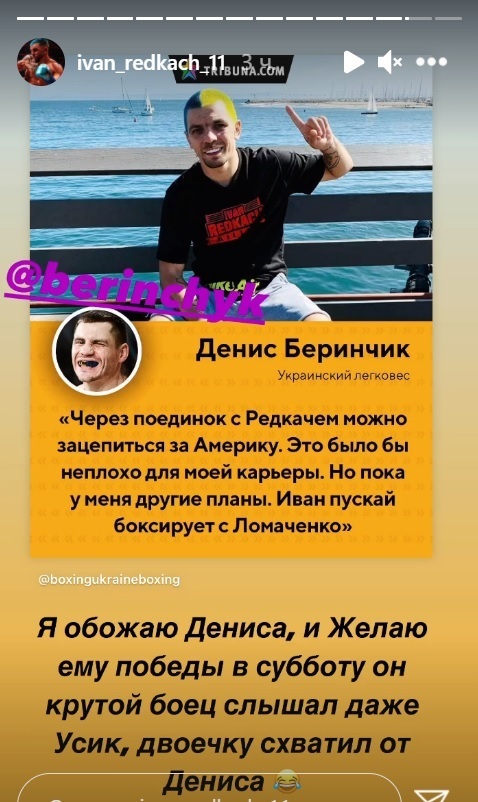 «Я обожаю Дениса и желаю ему победы в субботу. Он крутой боец, я слышал, что даже Усик двоечку схватил от Дениса», - написал Редкач в Instagram.