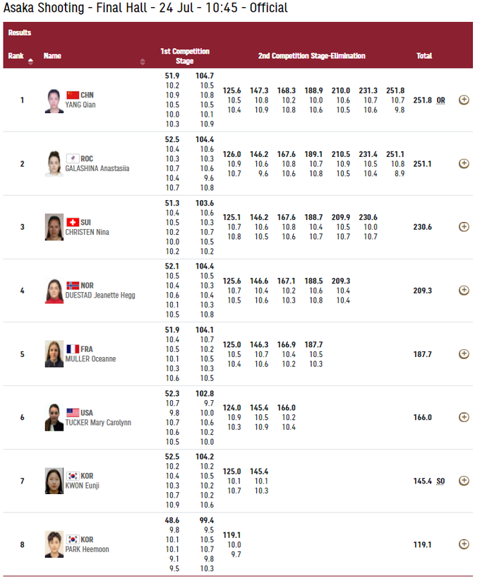 Китаянка Ян Цянь попала в цель точнее (9.8) и стала чемпионкой ОИ-2020 (с рекордом Олимпиад: 251.8), обогнала россиянку на 0.7 балла.