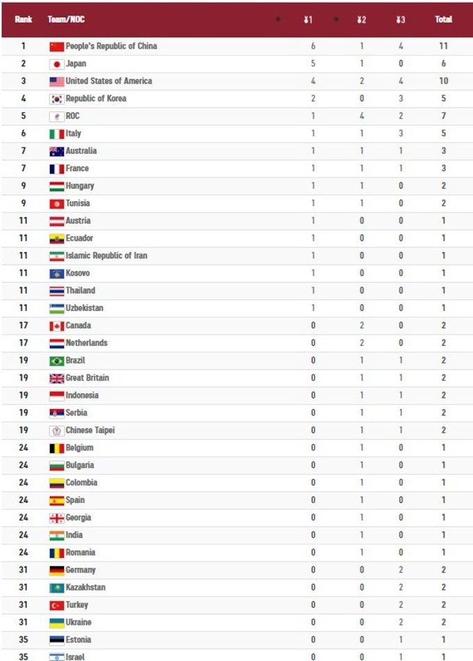 Лидируют Китай (11 медалей, 6 золотых), Япония (6 медалей, 5 золотых) и США (10 медалей, 4 золотых).
