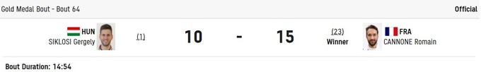 Малоизвестный спортсмен, который до Олимпиады в Токио не выигрывал серьезных наград на международном уровне, победил в финале действующего чемпиона мира Гергея Шиклоши из Венгрии (15:10).