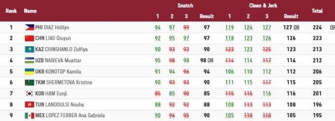 Подиум заняли представительницы Филиппин, Китая и Казахстана. Для Филиппин это первое золото в истории Олимпийских Игр.