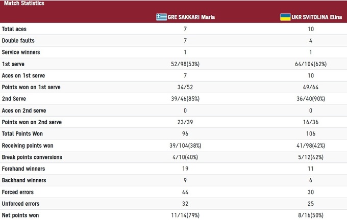 Во втором сете игра немного успокоилась, а Свитолина стала лучше играть на подаче. Хорошо полетела первая, в самые ответственные моменты проскакивали эйсы. Всего в сумме их получилось десять штук – прекрасный показатель для украинки даже в трехсетовом матче. Судьбу партии решил брейк уже в четвертом гейме, далее Элине удавалось выигрывать свои геймы. Гречанка в сумме имела три брейкпоинта, но реализации не было.