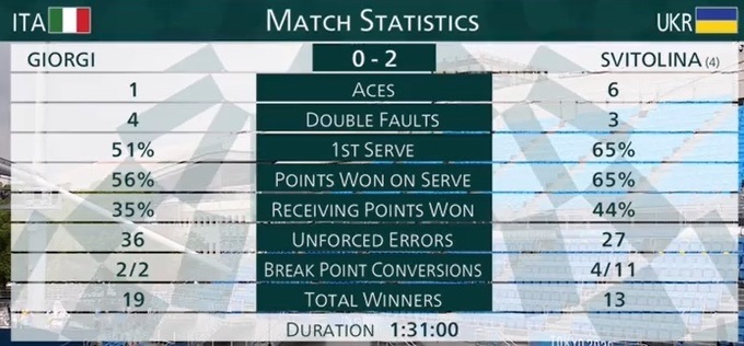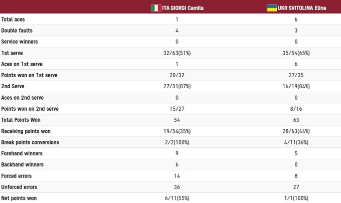 Наконец-то на этом турнире в матче Свитолиной все обошлось без особых нервов. Джоджи начала матч ужасно, чем и пользовалась украинская теннисистка. В первых геймах Элине нужно было только помогать итальянке ошибаться, с этим проблем не возникало.