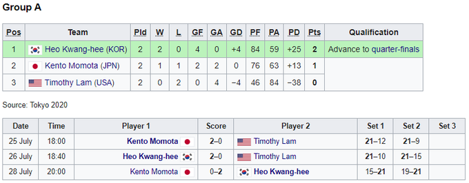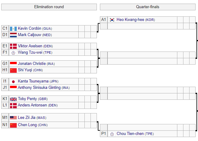 Лидер мирового рейтинга Кенто Момота из Японии на ранней стадии вылетел из турнира, проиграв малоизвестному корейцу Хо Кван-Хи (15:21 19:21). Момота завоевал золотые медали двух последних чемпионатов мира в одиночном разряде, но на ОИ даже не сумел преодолеть групповой раунд.