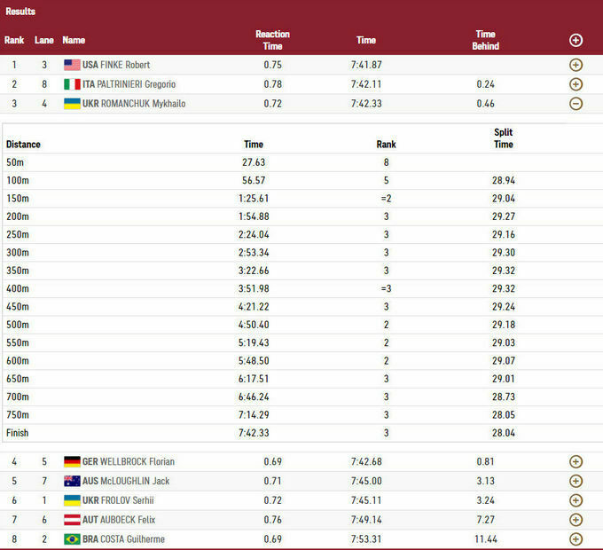 Романчук, от которого многие ждали медали высшей пробы, весь заплыв держался в группе лидеров, но финальный рывок выиграл американец Роберт Финке, которому и досталась золотая медаль с результатом 7:41.87. «Серебро» выиграл Палтриньери (7:42.11). «Бронзу» добыл Романчук (7:42.33). Фролов стал шестым (7:45.11).