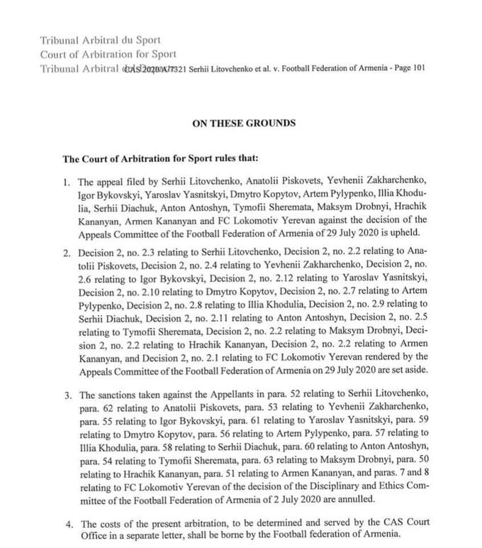 Спортивный арбитражный суд в Лозанне оправдал 9 украинских игроков и 2 тренера клуба «Локомотив» Ереван, дисквалифицированных за договорные матчи в Армении, сообщил адвокат Юрий Юрченко.
