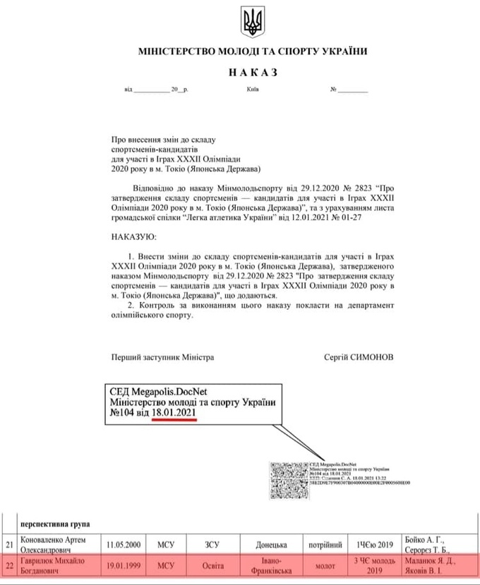 Однако есть другая информация. Ниже — скан-копия приказа Министерства молодежи и спорта Украины, созданного на основе письма ФЛАУ. Согласно этому документу, молотобойца Михаила Гаврилюка добавили в список кандидатов на Олимпиаду еще 18.01.2021. Кажется, времени на взятие проб было достаточно.