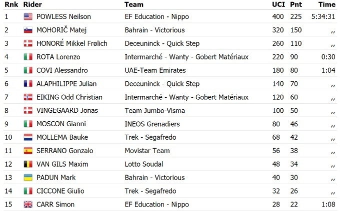 13-е место с отставанием в 1 минуту и 4 секунды занял украинец Марк Падун из команды «Bahrain Victorious».