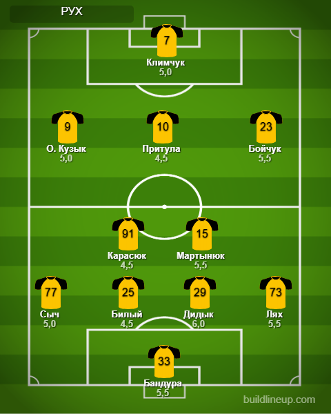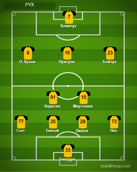«Рух»: Бандура, Сыч (Альваренга, 46), Билый, Дидык, Лях, Мартынюк, Карасюк (Ориховский, 46), Притула (Федорчук, 46), О. Кузык (Кондраков, 73), Бойчук, Климчук (Борячук, 63).