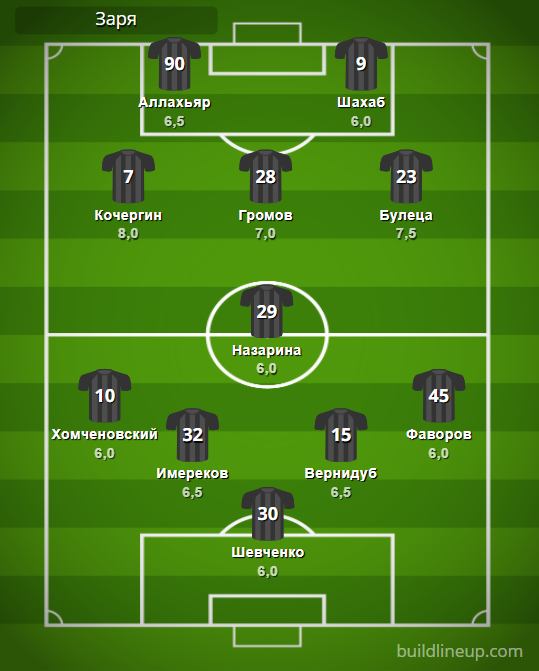 «Заря»: Шевченко – Хомченовский, Имереков (Снурницын, 87), Вернидуб, Фаворов (Руфати, 78) – Назарина – Кочергин, Громов (Фримпонг, 88), Булеца – Аллахьяр (Кристиан, 78), Шахаб (Лунев, 78).