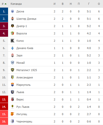 После двух туров первое место делят «Десна» Чернигов и «Шахтер» Донецк – по 6 очков из 6 (мячи: 5–1).