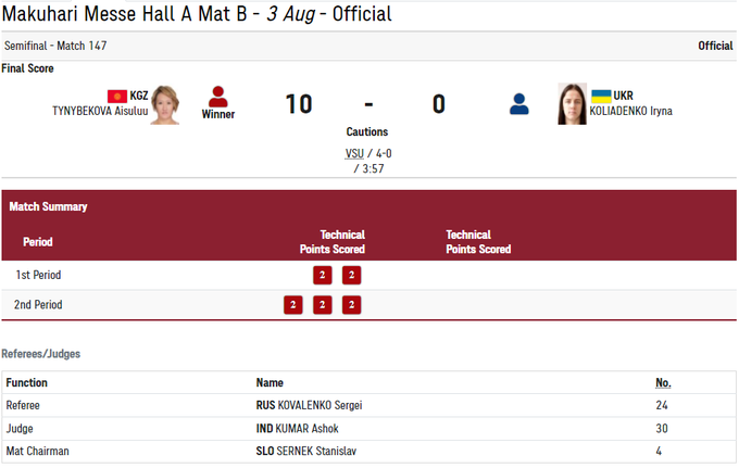 Ранее Коляденко в 1/8 финала досрочно победила Аминат Аденийи из Нигерии, а в 1/4 финала оказалась лучше Лун Цзя из Китая.