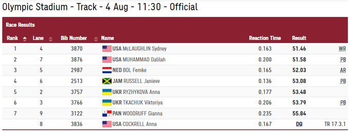 Американка Сидни Маклафлин установила мировой рекорд (51.46). На подиум также поднимутся Далила Мухаммад (США) и Фемке Бол (Нидерланды).
