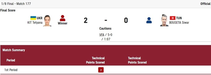 В первой схватке украинская спортсменка одержала победу над представительницей Туниса Сивар Бусетой (2:0) и вышла в четвертьфинал.