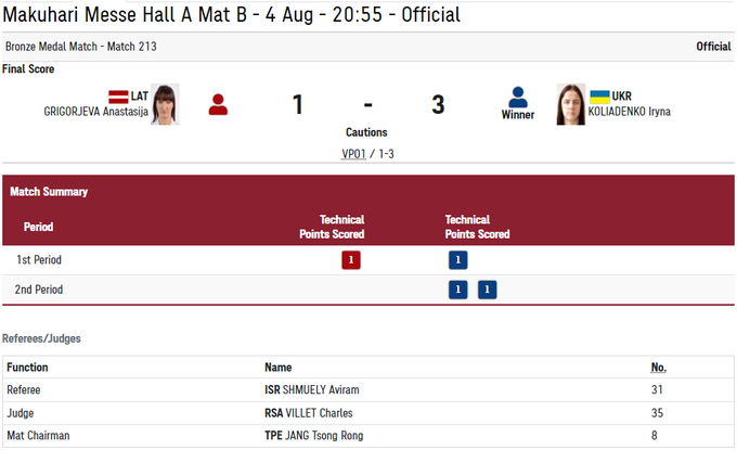 Днем ранее Коляденко в 1/8 финала досрочно победила Аминат Аденийи из Нигерии, а в 1/4 финала оказалась лучше Лун Цзя из Китая. А вот в полуфинале Ирина проиграла Айсулуу Тыныбековой, киргизской спортсменке.