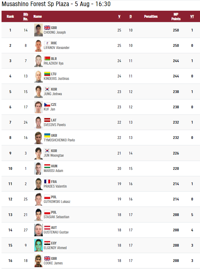 Украинец Павел Тимощенко в 1-м виде, фехтовании, с показателем побед 22-13 набрал 232 очка и занимает 8 место.