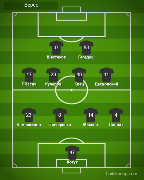 «Верес»: Когут, Солдат, Махнев, Гончаренко, Немчанинов, Клец (Полюлях, 62), Кучеров (Гечев, 77), Дахновский (Е.Пасич, 62), Гегедош (Панасенко, 77), Г.Пасич, Шестаков (Сергийчук, 46)