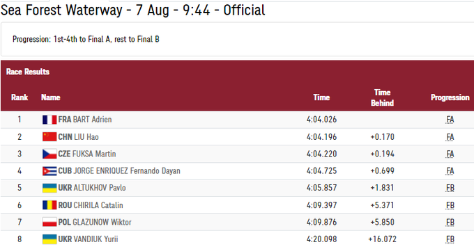 В полуфинале Алтухов финишировал 5-м, а Вандюк занял последнее 8-е место. Оба украинских каноиста теперь выступят в финале Б, где поборются за 9-е место.