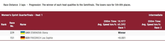 Старикова лишь на одну тысячную секунды опередила Лею Софи Фредерих из Германии. Счет 1:0. Четвертьфинал проходит по системе до двух побед.