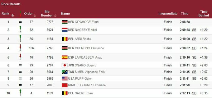 Марафонский забег выиграл кениец Элиуд Кипчоге, пробежавший дистанцию за 2:08:38. Второе место занял голландец Абди Нагейе (2:09:58), третьим стал бельгиец Башир Абди (2:10:00).