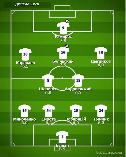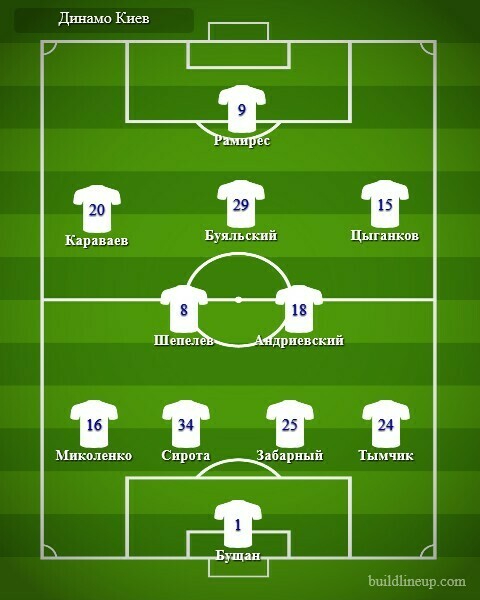 «Динамо»: Бущан, Миколенко, Сирота, Забарный, Тымчик, Андриевский (Сидорчук, 68), Шепелев (Шапаренко, 62), Караваев (Сидклей, 62), Буяльский (Леднев, 80), Рамирес (Гармаш, 62), Цыганков.