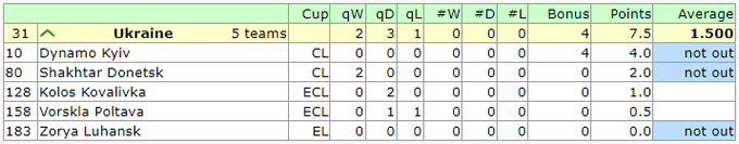 В активе Украины – 4 бонусных очка «Динамо» за участие в группе ЛЧ, 2 балла «Шахтера» за две победы в отборе ЛЧ, 1 очко «Колоса» и 0.5 пункта «Ворсклы» за квалификацию ЛК. Если 7.5 поделить на 5 клубов, то результат страны в текущем сезоне = 1.500.
