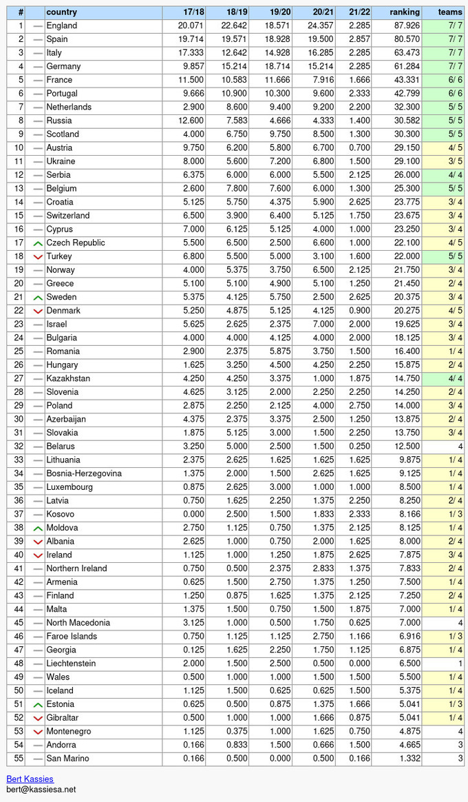 Таблица коэффициентов УЕФА 2022