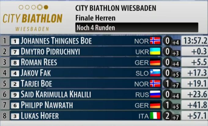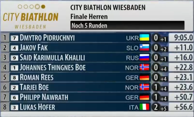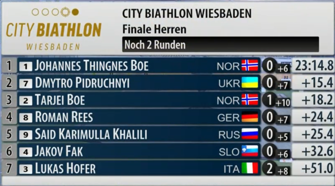 17:26. Ситуация после второй стрельбы: Пидручный первый, словенец Фак второй, россиянин Халили третий.