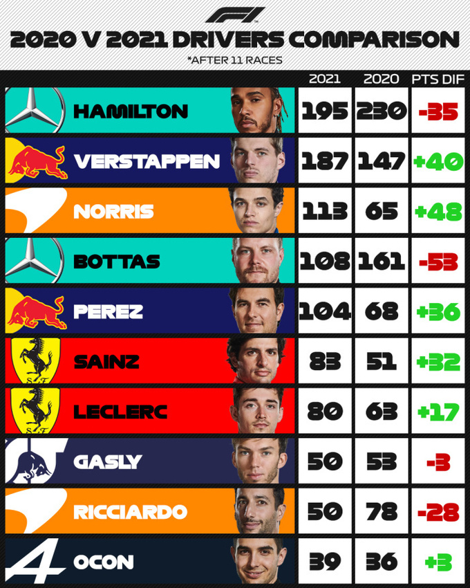 Когда в Макларен пришел Даниэль Риккардо, то казалось, что австралиец быстро вытеснит напарника на вторые роли, но как раз Даниэль пока не в состоянии конкурировать с юным Норрисом. Ландо набрал на 63 очка больше, чем Риккардо, и до сих пор удерживается в топ-3 общего зачета, опережая и Боттаса, и Переса, у которых более быстрые болиды.