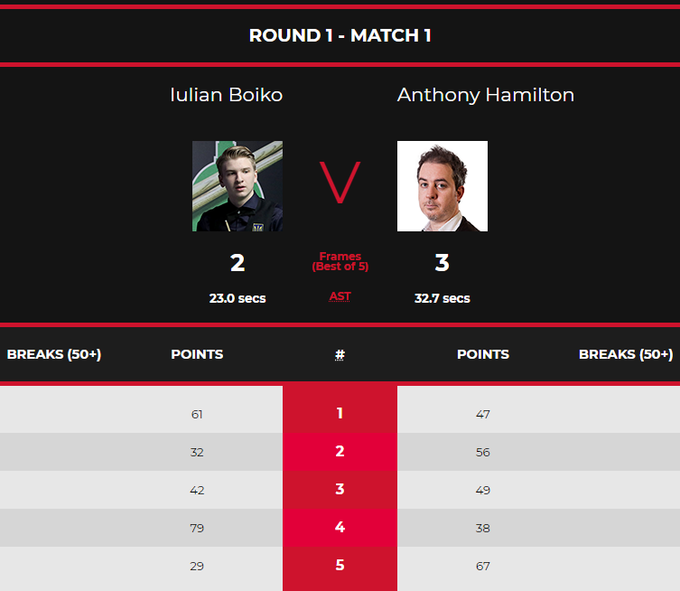 15-летний украинский снукерист Юлиан Бойко проводит очередной матч в Мировом снукерном туре. Его соперник – 50-летний ветеран Энтони Хэмилтон из Англии.