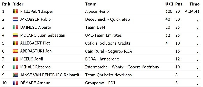 Бельгийский гонщик команды «Alpecin Fenix» Яспер Филипсен стал победителем пятого этапа Вуэльты-2021. В финишном спринте он опередил Фабио Якобсена и Альберто Дайнезе. Для Филипсена это уже вторая победа на нынешней Вуэльте – ранее он выиграл второй этап.