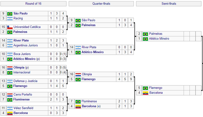 Интересно, что в 1/2 финала могли сыграть исключительно бразильские клубы, если бы «Барселона» не прошла «Флуминенсе». Однако ответный матч в Гуаякиле завершился со счетом 1:1, этот результат оставил «Флуминенсе» за бортом турнира.
