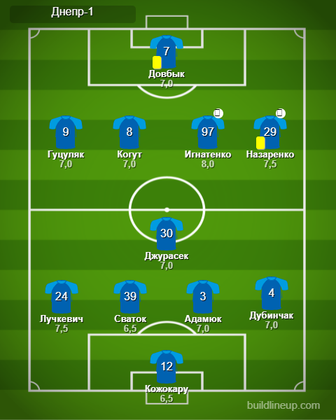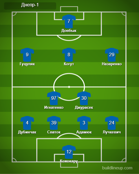 «Днепр-1»: Кожокару, Лучкевич (Логинов, 79), Адамюк, Сваток, Дубинчак, Джурасек, Игнатенко (Батагов, 79), Когут (Чуже, 76), Гуцуляк (Русин, 76), Назаренко (Ярмолюк, 90), Довбык.