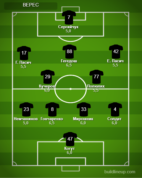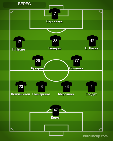 «Верес»: Когут, Солдат, Мирошнык, Гончаренко, Немчанинов, Кучеров, Полюлях (Клец, 78), Е. Пасич (Дахновский, 85), Гегедош (Гечев, 67), Г. Пасич (Тымофиенко, 85), Сергийчук (Панасенко, 77).