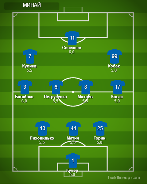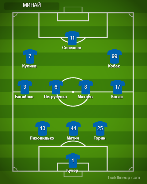 «Минай»: Кучер, Лиховидько, Кныш (Гончар, 68), Горин, Матич (Векляк, 68), Кулиев, Кобак (Билоног, 56), Селезнев (Ахмедзаде, 56), Хахлев, Петрусенко, Багайоко (Синегуб, 68).