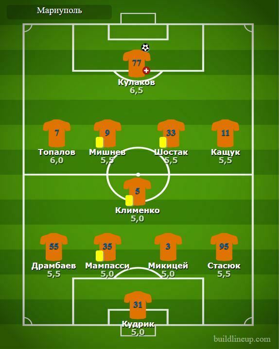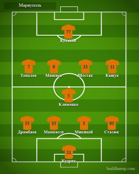 «Мариуполь»: Кудрик, Драмбаев, Микицей (Удод, 46), Мампасси, Стасюк, Клименко (Микитишин, 72), Мишнев, Шостак (Хромей, 63), Топалов, Кащук (Свитюха, 46), Кулаков (Вьюнник, 57).